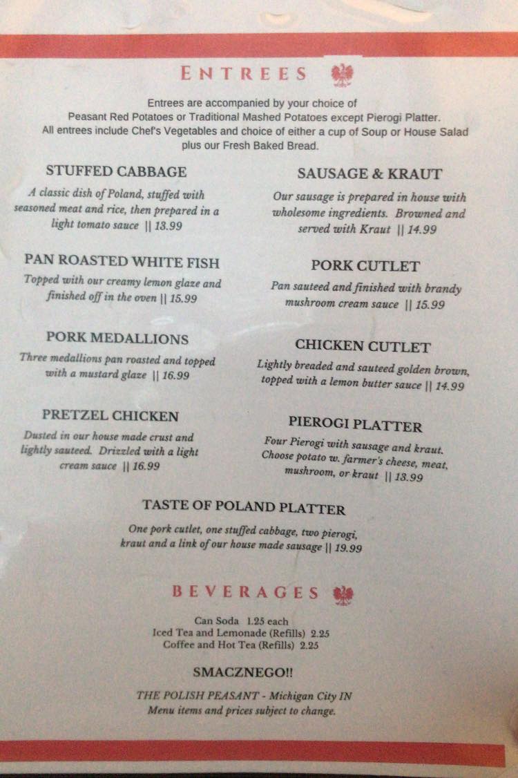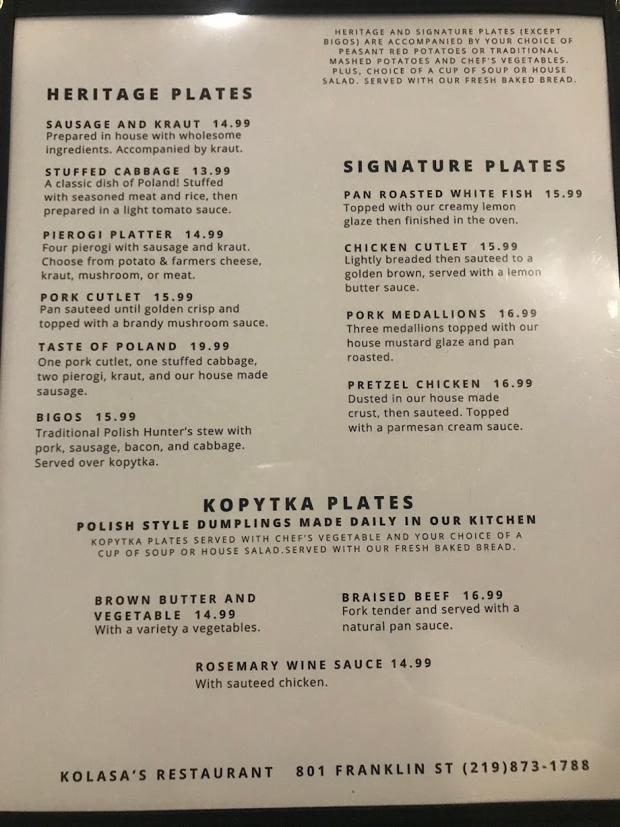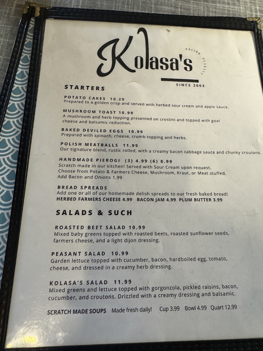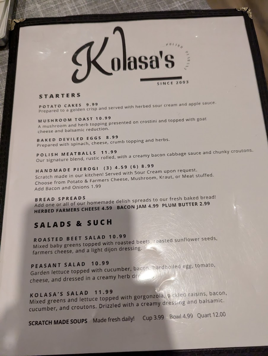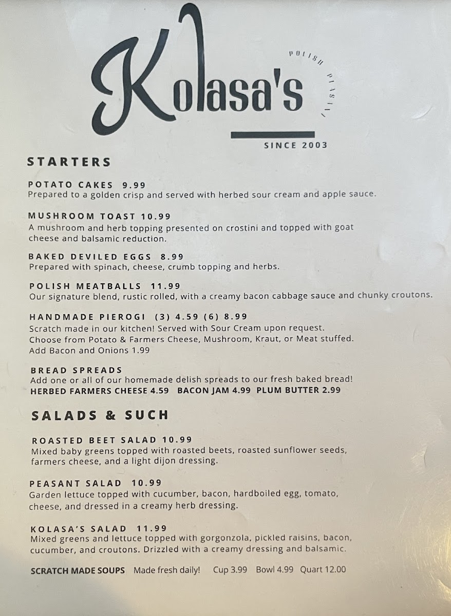 Kolasa’s Restaurant (The Polish Peasant) Menu